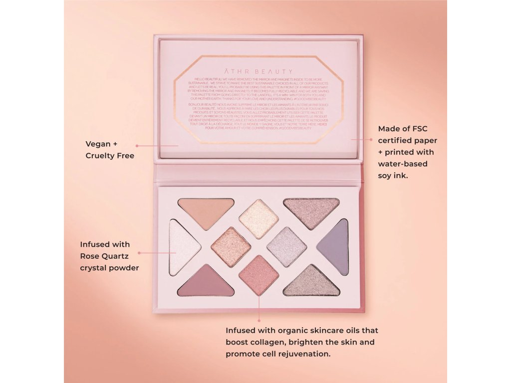 Paletky očních stínů jsou bez magnetů, zrcadel a nehospodárných materiálů, jsou prvními ZERO WASTE paletkami na trhu. Každá paletka očních stínů ATHR Beauty je vyrobena z papíru s certifikací FSC, sójového inkoustu na vodní bázi a recyklovaných hliníkových misek, což znamená, že jakmile paletku doděláte, můžete misky jednoduše vyndat a recyklovat každou část zvlášť.
