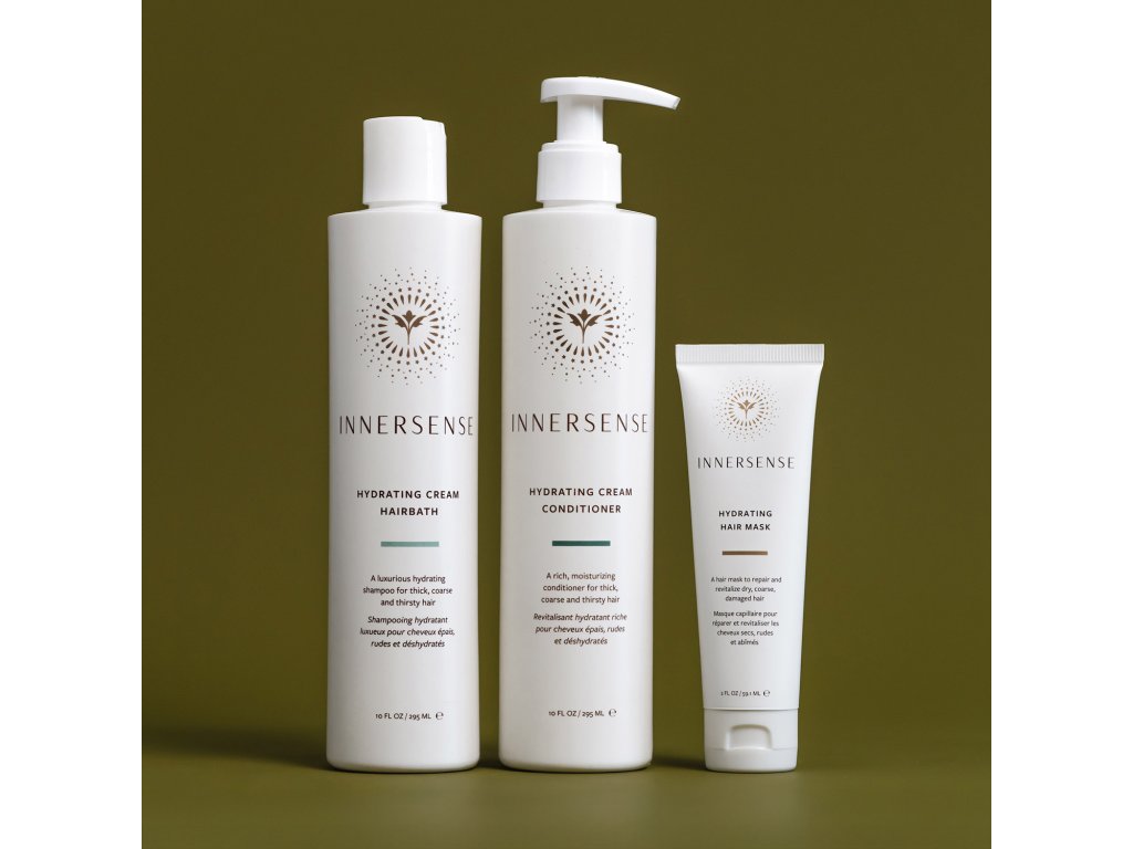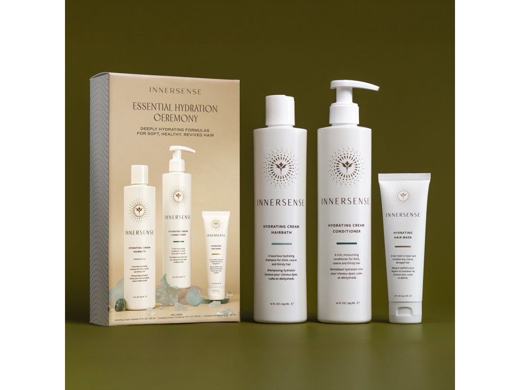 INNERSENSE Essential Hydration Ceremony doprajte svojim vysušeným vlasom hydratáciu pomocou troch produktov z hydratačnej rady. Vlasy umyte krémovým šampónom, ktorý ich hydratuje a zároveň zvyšuje ich pružnosť a lesk. Následne použite krémový kondicionér, ktorý vlasy hlboko vyživuje a hydratuje pomocou prírodných výživných zmäkčovadiel. Pre extra výživu ošetrite vlasy maskou, ktorá im vráti jemnosť a hydratáciu.