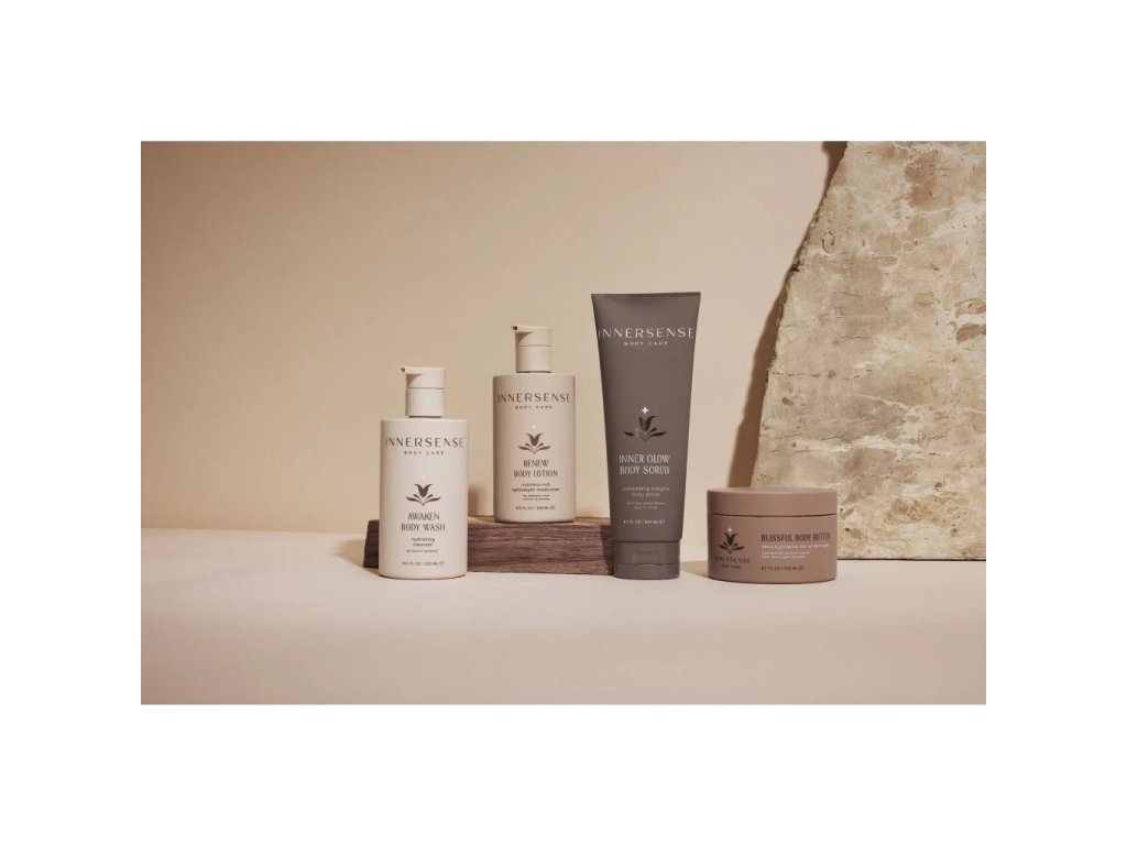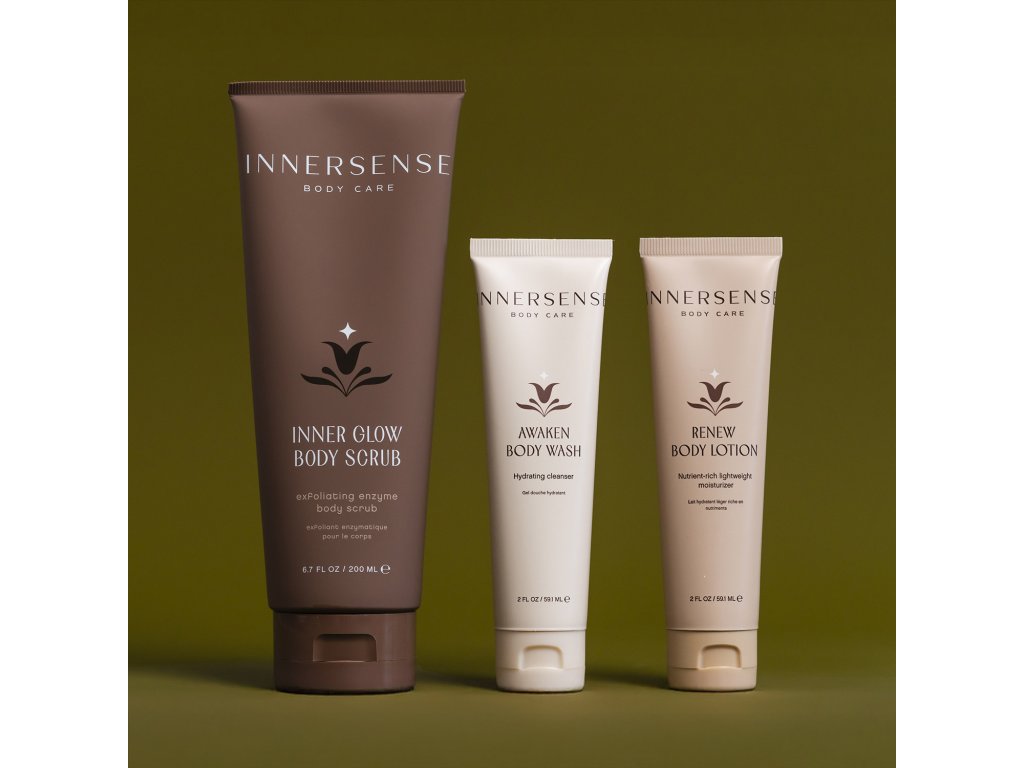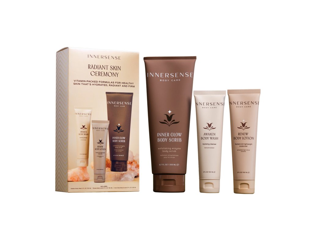 INNERSENSE Radiant Skin Ceremony ponúka zdravšiu a žiarivejšiu pokožku vďaka výživnej trojfázovej starostlivosti o telo. Odstráňte všetko, čo vám nevyhovuje, s Inner Glow, revitalizujúcim peelingom bohatým na antioxidanty, ktorý kombinuje cukor a ovocné enzýmy, aby odhalil žiarivú pleť. Osviežte svoje telo a myseľ s Awaken Body Wash, osviežujúcim čistiacim prostriedkom, ktorý harmonizuje pleť bez jej vysušovania. Doplňte vlhkosť a pocítite omladenie s Renew Body Lotion, ľahkým krémom, ktorý zanecháva pleť hydratovanú a zdravú. Tieto receptúry sú obohatené o Vitarevive Trio, zmes vitamínov B5, C a D, ktoré zvyšujú vlhkosť, žiarivosť a pružnosť pleti.