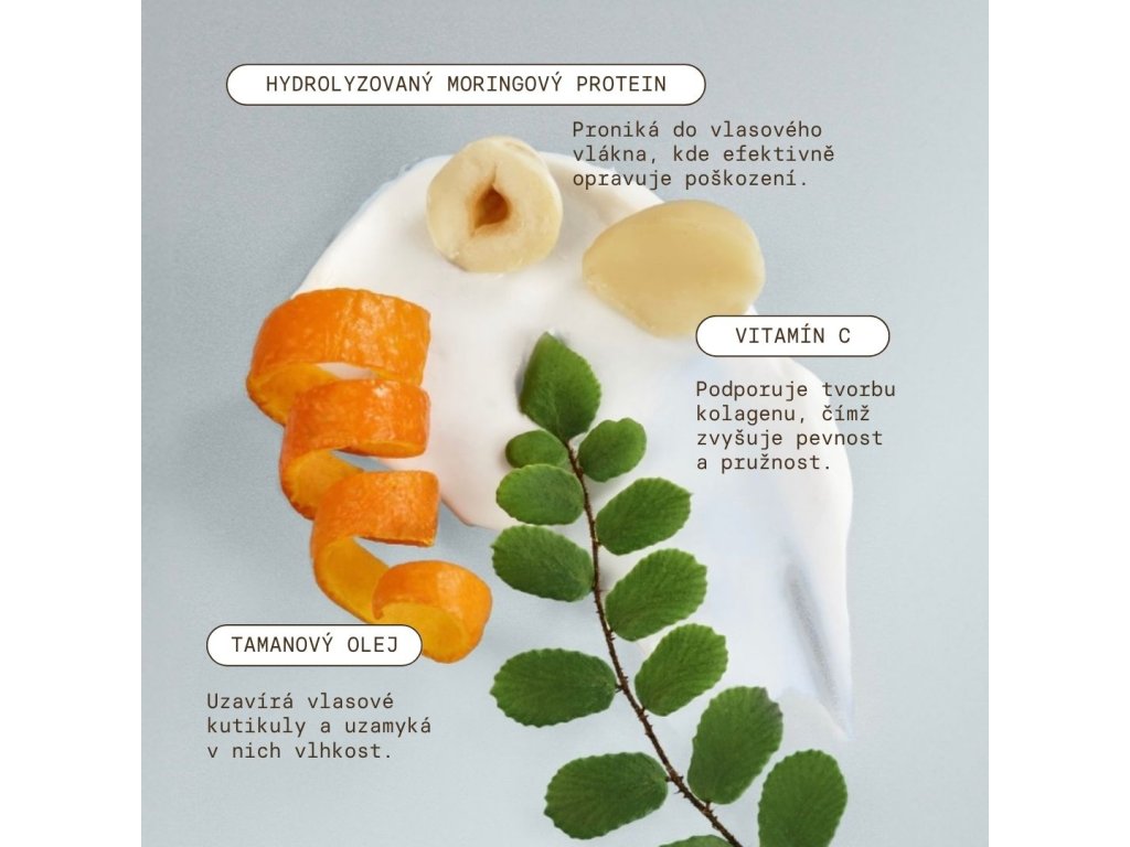 Hydrolyzovaný moringový proteín – preniká hlboko do vlasovej kôry, kde cielene regeneruje poškodené štruktúry. Na rozdiel od syntetických zložiek, ako sú silikóny, pôsobí zvnútra a dlhodobo posilňuje vlasové vlákna.
