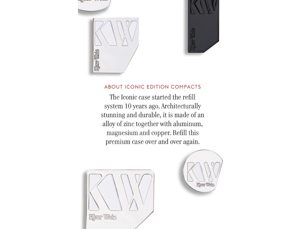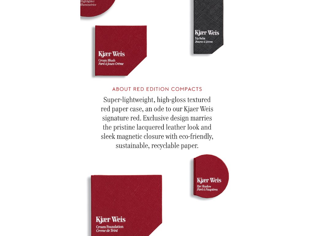 Kjaer Weis udáva nový smer s vysoko výkonným, luxusným make-upom, ktorý má všetko čo má mať. Je organický, udržateľný a vysoko funkčný. Ingrediencie, ktoré skutočne fungujú. Či už sa jedná o farbu pier vychádzajúcu z odtieňa starého trička alebo osobnú prehliadku každej novej šarže výrobkov kvôli konzistencii farieb a textúr, Kjaer Weis zaručuje nielen, že sú všetky ingrediencie certifikované ako prírodné alebo organické, ale vždy dosahujú štandardy luxusnej krásy. Tak vzniká make-up, ktorý skutočne funguje a pracuje s kožou, nie proti nej.