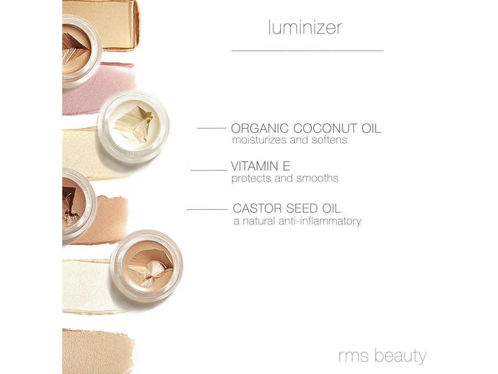 Zabudnite na neprirodzené rozjasňovače. Luminizer od RMS Beauty vsádza na prirodzenosť, a tak v ňom nenájdete veľké trblietky ani vás nepotrápi mastnou textúrou. Naopak sa tešte na produkt, ktorý prirodzeným spôsobom dodá vašej pleti iskru a rozžiari ju na všetkých miestach, kde je treba. Neoddeliteľnou súčasťou je prvotriedne zloženie na čele s vitamínom E, ktorý chráni a vyhladzuje pokožku. Organický kokosový olej zase zaručí, že pleť bude hydratovaná a dokonale jemná. Trojicu super zložiek uzatvára ricínový olej s protizápalovými vlastnosťami a schopnosťou detoxikovať a upokojovať pokožku.