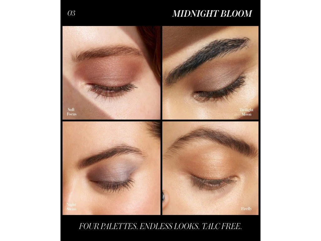 Paleta očných tieňov bez obsahu mastku, ktorá obsahuje štyri sýto pigmentované odtiene s rôznymi povrchovými úpravami – matné, saténové a metalické – pre nekonečné množstvo pútavých líčení. K dispozícii v štyroch hravých farebných kombináciách, z ktorých každá obsahuje štvoricu ikonických odtieňov, ktoré v dokonalom súlade zostavila sama Rose-Marie.